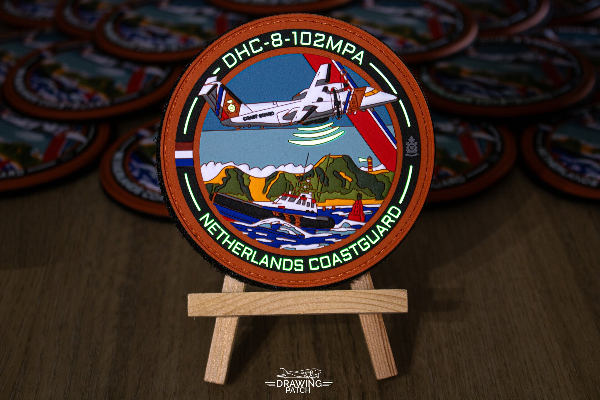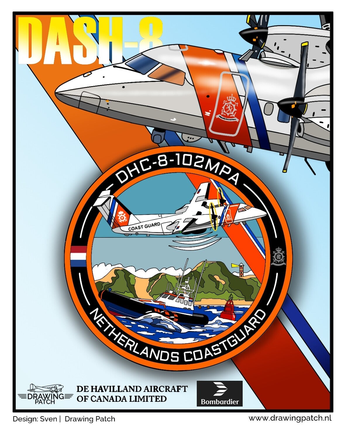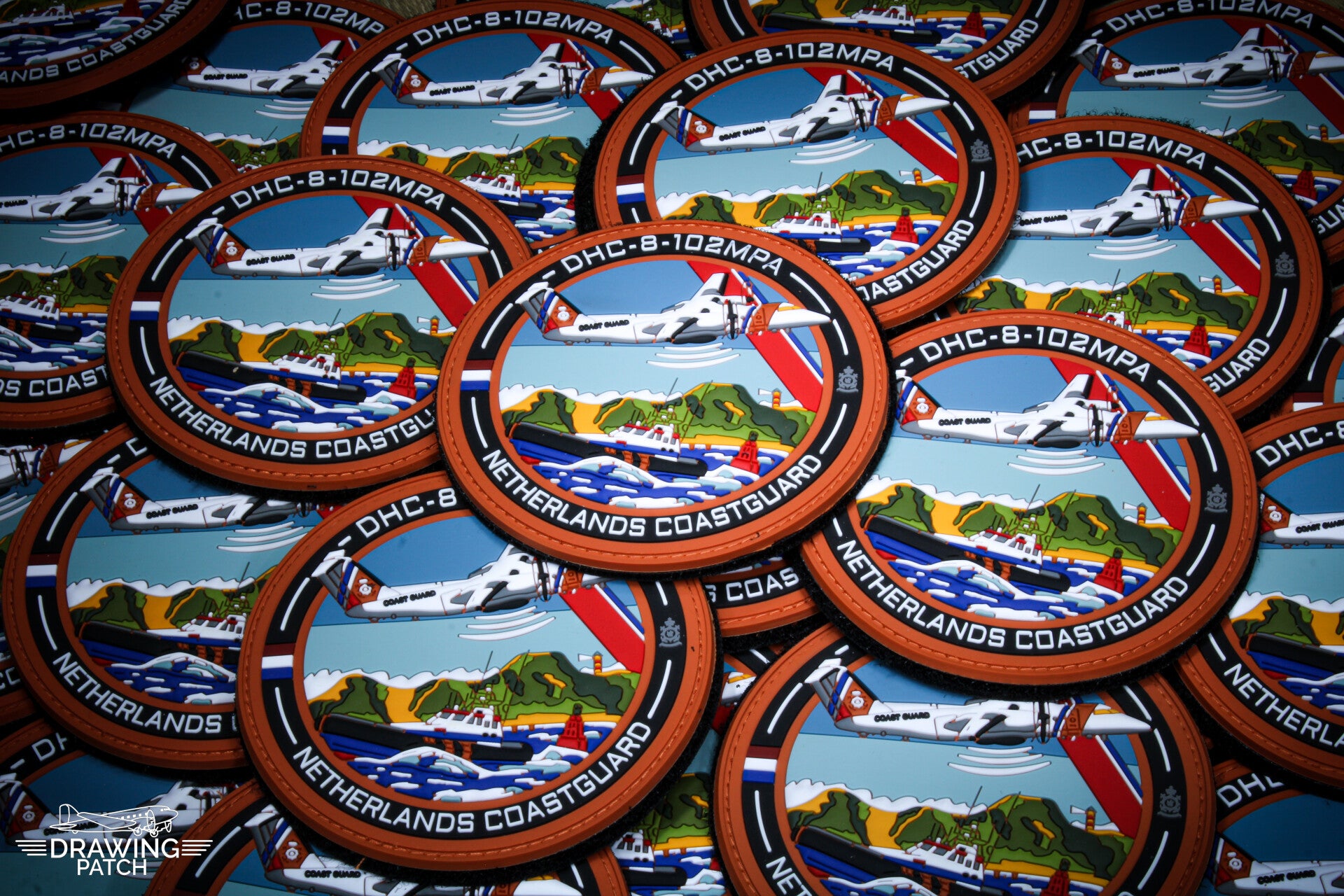 The patch features the iconic "De Havilland Canada Dash 8" in the Netherlands coastguard livery. The aircraft is known for her role in maritime surveillance, Search and rescue operation, environmental monitoring, and border control missions all over the globe.